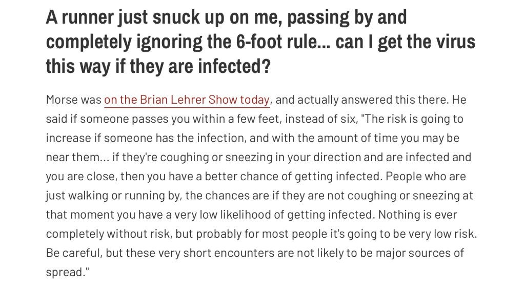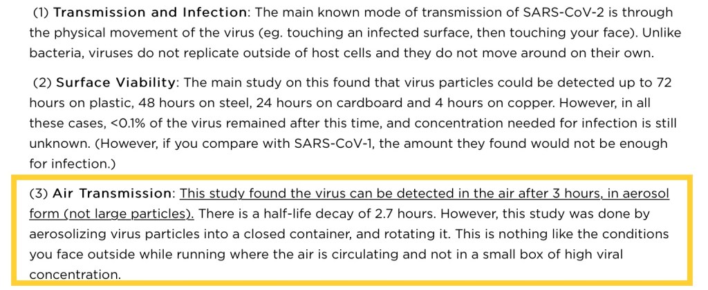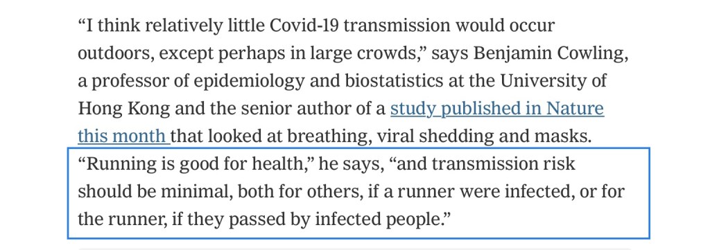 I’ve compiled here 5 articles and a Facebook post from a pathologist. I invite you to read each in their entirety, but I’m highlighting here specific sections that I think offer clarity and dispel myths on how the virus is spread, with a particular focus on outdoor running. These selections all come from different experts in the field but you’ll notice there is a great deal of overlap and agreement among them. That, I believe, speaks to the credibility. I have also gone to considerable lengths to abstain from offering my opinion. Instead, I hope you will read and draw your own conclusions.