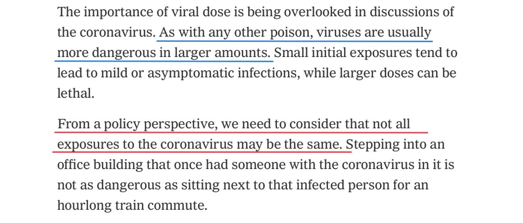 The second article published in the New York Times on April 1st, outlines why virus risk must be considered from the lens of viral load. The full article is linked to here. A highlight from: